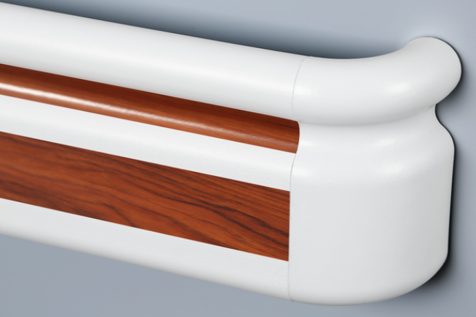 醫用防撞扶手在防腐、防潮、防霉、防蟲等方面保留了PVC材質的優質特性。可以通過改變橫截面形狀,生產出各種形狀復雜的型材,解決木制家具生產中的材料消耗問題。